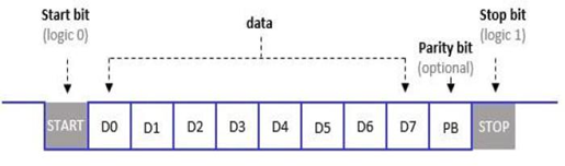 비동기통신은 평상시 클럭 신호를 보내지 않는다. 대신에 보낼 데이터가 있을 때 Start bit를 보낸 후 데이터를 쭉~ 보내고 다 보냈으면 Stop bit를 보낸다. 따라서 동기 통신에 비해서는 전송속도가 느릴 수밖에 없다.