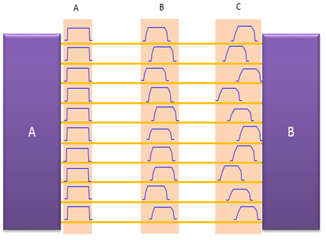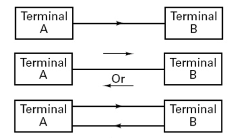 양방향은 다시 반이중 통신(Half Duplex)과 전이중 통신(Full Duplex)로 구분이 된다. 아래 [그림2]에서 단말 A가 데이터를 보낼 때, 단말 B는 받기만 할 수 있고, 단말 B가 데이터를 보내려면, 단말 A가 송신을 마쳐야 가능한 경우를 반이중 통신이라고 한다. 무전기를 사용해서 통화를 하는 경우, 일반적으로 반이중 통신을 사용한다. 즉, 한쪽이 통화 버튼(Push-To-Talk)을 누르고 말을 하게 되면, 상대방은 듣기만 할 수 있으며, “오버"라는 말과 함께 자신의 차례가 끝났음을 알리면, 이제는 역할을 바꾸게 된다.