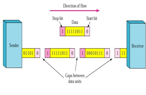 한편, 데이터 통신에 있어서 두 부품, 두 기기가 클럭으로 동기화되지 않으면 비동기식 통신이라고 한다. 비동기식 전송(asynchronous transmission)은 보통 5비트, 또는 8비트 크기의 문자 단위와 같이 매우 작은 비트 블럭의 앞과 뒤에 각각 문자의 시작과 끝을 알리는 스타트 비트(start-bit)와 스톱 비트(stop-bit)를 붙여서 전송하는 방식으로 스타트-스톱 전송이라고 불리기도 한다.