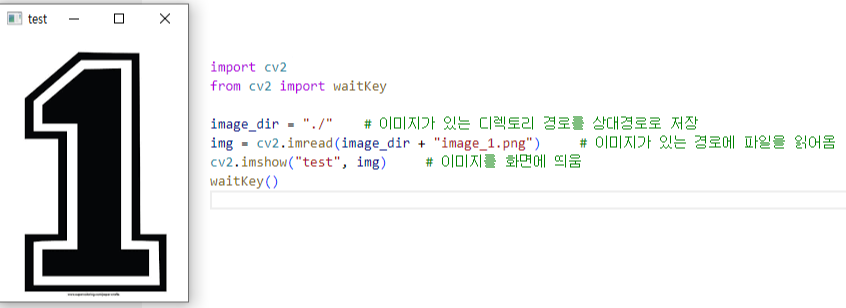 참고로 image_1.png 파일 앞에 역슬레쉬가 두 개인 이유는 문자열에서 역슬레쉬를 표현할 때는 역슬레쉬를 두 개 사용해야 하기 때문이다. 따라서 (image_dir + "\\image_1.png") 문장은 "C:\pythonworkspace\image_1.png"로 대체된다.