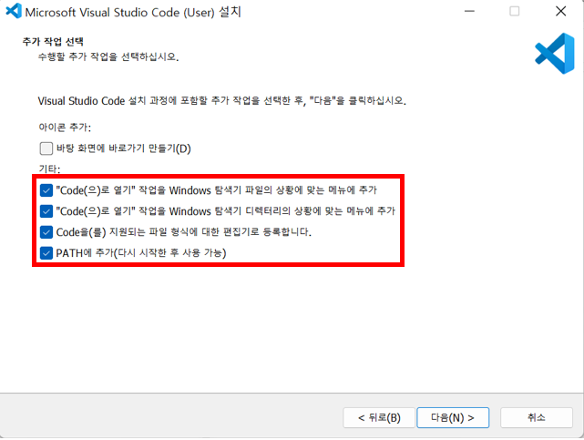 아래 그림에 해당하는 탭에서 모두 체크한 뒤 다음을 누른다.