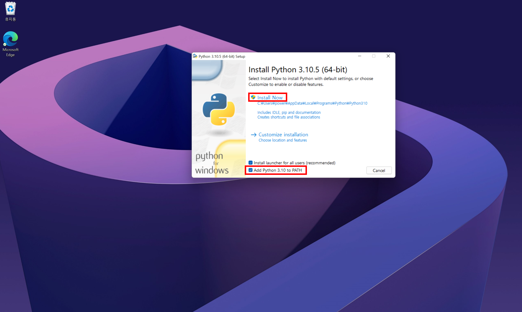 3) 다운받은 파일을 열어 Add Python 3.10 to PATH에 체크한 뒤 Install Now 클릭한다.