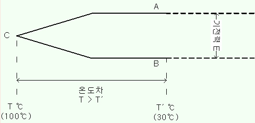 위 그림에서 C가 측정점 혹은 Hot junction(뜨거운 접점)의 온도이다. A와 B를 Tref(레퍼런스 온도) 혹은 Cold junction(차가운 접점)이라 한다. 써모커플은 C의 온도를 아는 것이 목적이다. 제베크 효과에 의하면 C의 온도를 알기 위해서는 Tref와 기전력을 알고 있어야 한다. 특히 Tref를 아는 것이 중요한데 그 이유는 0 ~ 50℃ 사이의 기전력과 50 ~ 100℃ 사이의 기전력은 차이가 있기 때문이다. 그래서 Tref를 알아야 하며, 여기에 기전력을 추가하여 C의 온도를 Table(온도차이에 따른 기전력을 계산한 표)에서 찾을 수 있다.