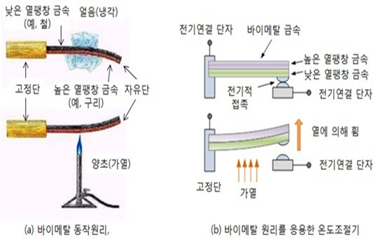 바이메탈 온도센서는 아래 그림과 같이 열을 가했을 때 휘는 정도가 다른 성질을 이용하여 온도를 측정하는 원리이다. 열팽창이 작은 금속으로는 보통 니켈(Ni)과 철(Fe)의 합금이 사용되며, 팽창이 큰 금속으로는 니켈·망간·철의 합금, 니켈·몰리브덴·철의 합금, 니켈·망간·구리의 합금 등을 주로 사용한다. 그림 (a)와 같이 얼음으로 냉각시키게 되면, 수축이 잘 되는 구리 쪽이 빨리 굽어지기 때문에 아래 방향으로 막대가 휘게 되고, 열을 가하게 되면, 마찬가지로 팽창이 잘 되는 구리 쪽이 더 많이 늘어나기 때문에 막대가 위쪽으로 향하게 된다. 이런 원리를 응용한 것이 (b)와 같은 온도조절기(thermostat)이다. 온도조절기는 일정 온도를 기준으로 스위치를 on/off 하는 역할을 하여 일정 온도가 유지되도록 하는 소자이다. 바이메탈 온도스위치는 전기밥솥, 전기포터, 다리미, 전기장판 등 다양한 분양에 응용되고 있다.