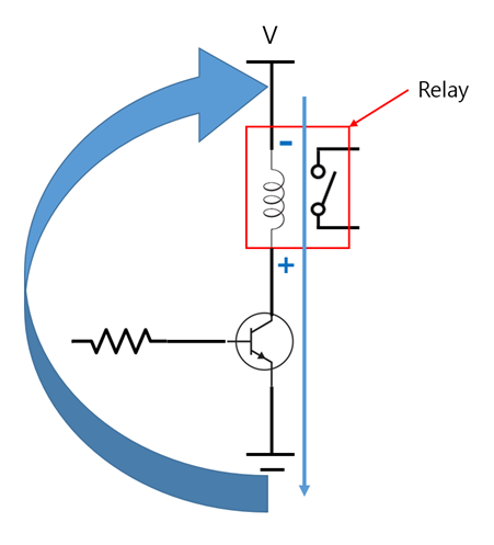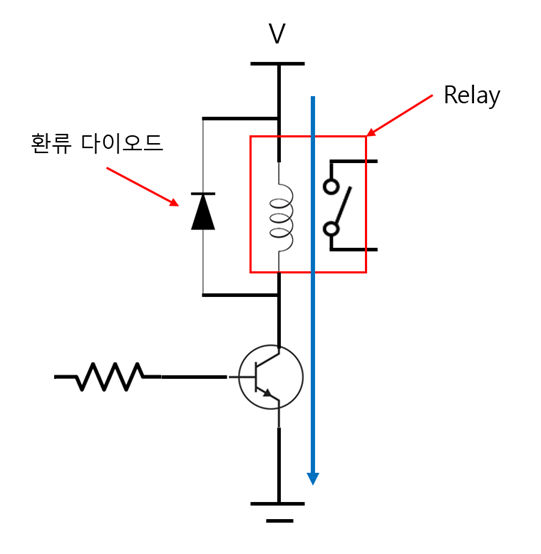 그림1은 환류 다이오드 회로를 나타낸 것이다. 트랜지스터(스위치 역할)가 ON되면 파란색과 같이 전류가 흐르게 된다. 그럼 트랜지스터(스위치 역할)를 OFF하면 어떻게 될까?