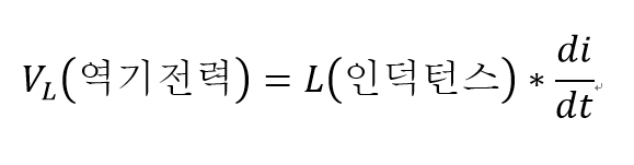 Inductor는 모터나 Relay에 사용되며 전류의 변화를 싫어한다. 따라서 전류가 증가한다면 Inductor는 그 증가를 억제하는 방향으로, 전류가 감소한다면 그 감소를 억제하는 방향으로 역기전력이 발생한다. 아래는 역기전력을 식으로 나타낸 것이다.