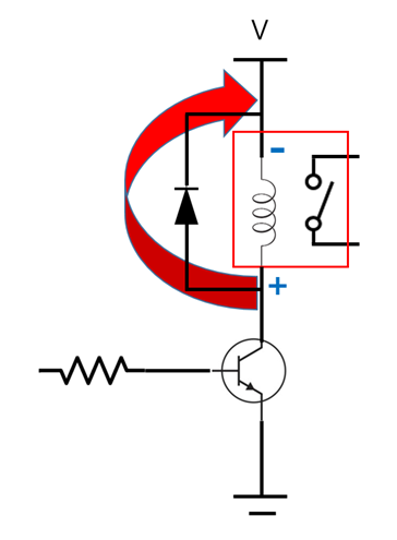 트랜지스터가 OFF되면 전류가 급격히 감소하기 때문에 Inductor는 전류를 계속 흘리려고 할 것이다. 그래서 그림2처럼 반대방향으로 +-가 형성된다(+에서 나와서 –로 흐르므로). 그런데 역기전력의 크기가 다이오드가 없으면 전원전압보다 굉장히 크게 된다. 역기전력은 계속 지속되는 것이 아니라 아주 짧은 순간에 순간적으로 발생하는 일종의 과도전압인데 그 전압에 의해서 트랜지스터 같은 소자들이 데미지를 입을 수 있다. 따라서 이를 보호하기 위해 아래 그림3처럼 환류 다이오드로 전류를 흐르게 한다.