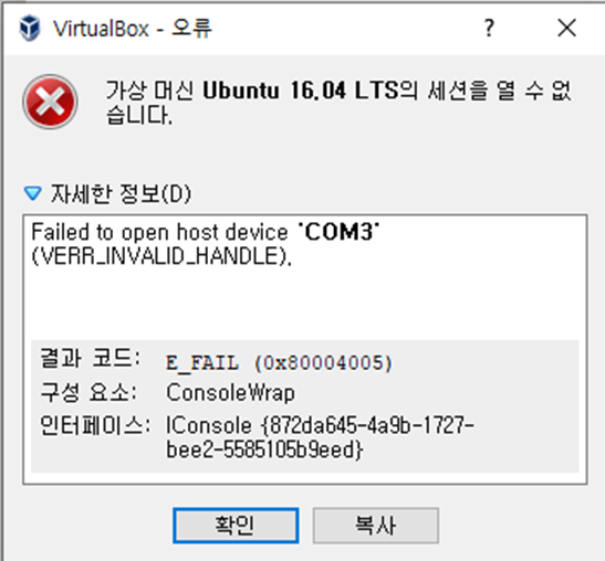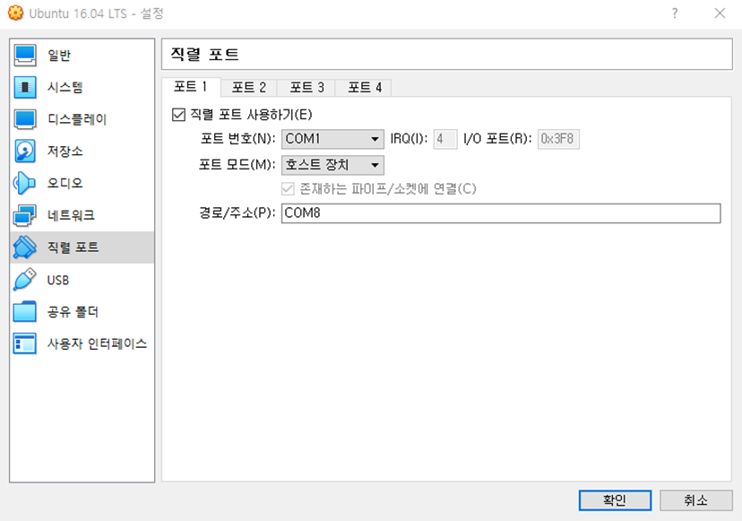 위 그림은 Oracle VM VirtualBox의 직렬 포트 탭 화면이다. 경로에 연결할 포트가 COM3으로 되어 있었는데 실제로 연결된 포트는 COM8이므로 에러가 났다. 따라서 직렬 포트를 사용에 체크하고 경로를 COM8로 변경하니 에러가 해결 되었다.