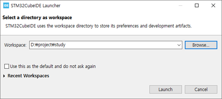 8. 프로그램을 실행한 뒤 Workspace에 7번에서 만든 폴더로 경로를 지정한다.