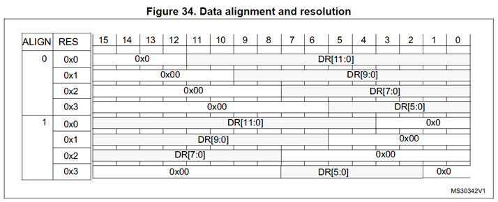 결과 값을 16bit 레지스터에 저장할 때 12bit 결과 값이 오른쪽에서부터 저장할건지 왼쪽에서부터 저장할건지 설정하는 곳이다.