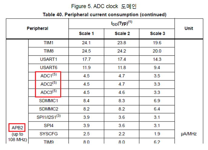 (PCLK 및 ADC 비동기 clock이 활성화되는 방법을 보려면 Figure 26: ADC clock 구성표 참조):