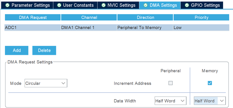 여기서는 12bit ADC를 사용하므로 16bit인 Half Word로 설정하면 된다.