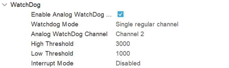 위와 같이 조건을 설정했다고 한다면 채널 2번을 conversion한 값이 3000을 넘어가거나 1000 아래로 떨어지면 인터럽트가 발생된다.