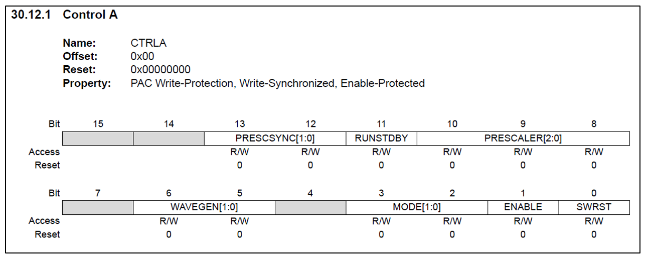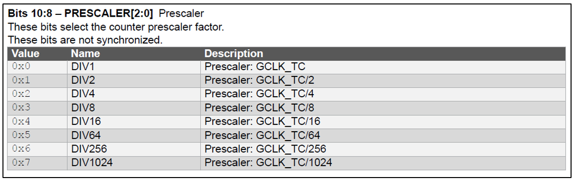 TC4->COUNT16.CTRLA.reg |= TC_CTRLA_MODE_COUNT16 | TC_CTRLA_WAVEGEN_MFRQ | TC_CTRLA_PRESCALER_DIV256;