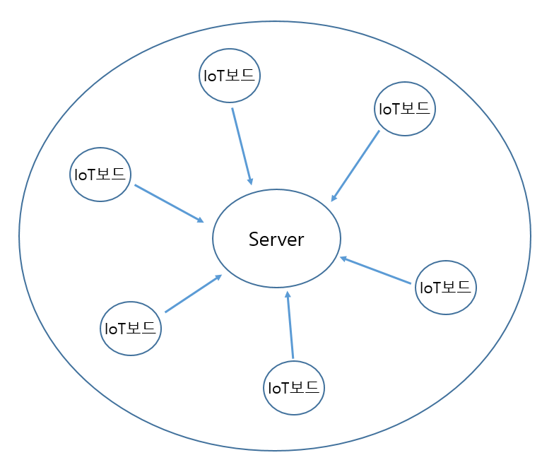 TCP 통신에서는 네트워크에서 식별할 수 없는 인터넷 공유기의 사설 인터넷 망에 연결된 IoT보드들이 있고, 이 보드들이 고정IP를 가진 서버에 접속을 한다. 서버는 IoT보드들을 네트워크에서 찾을 수 없지만 IoT보드들은 서버를 찾을 수 있기 때문에 IoT보드들이 서버하고 소켓을 생성하여 연결되게 되면 서로 각각의 소켓을 통해 서버와 IoT보드들이 데이터를 주고 받을 수 있다.