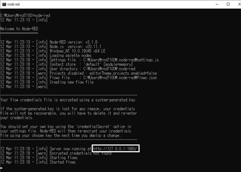 CMD창에 아래의 명령어를 입력하여 Node-RED를 실행한다.