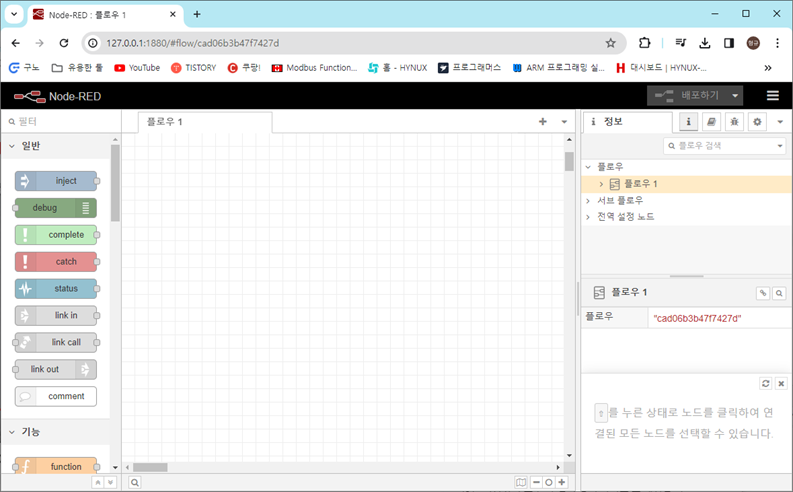 Node-RED를 실행하면 아래 그림1과 같이 Node-RED가 실행된다.