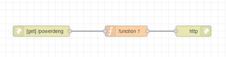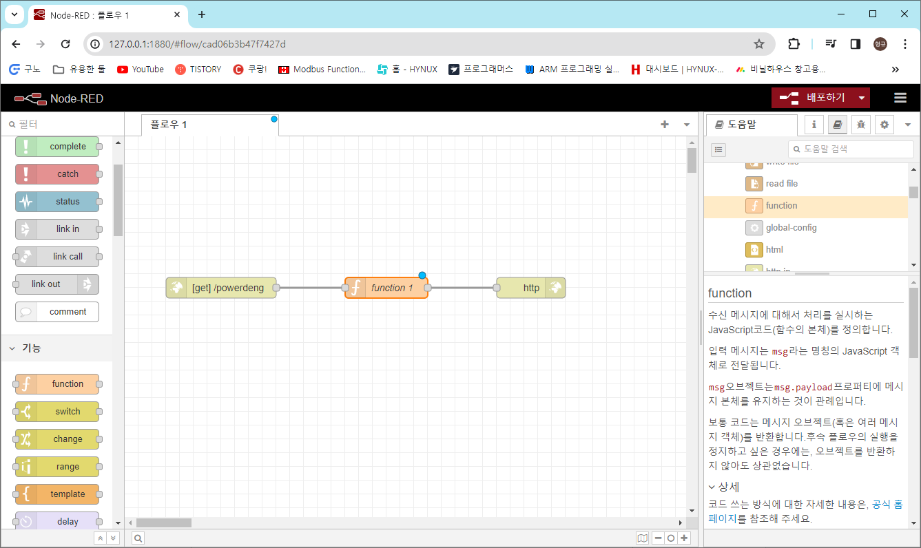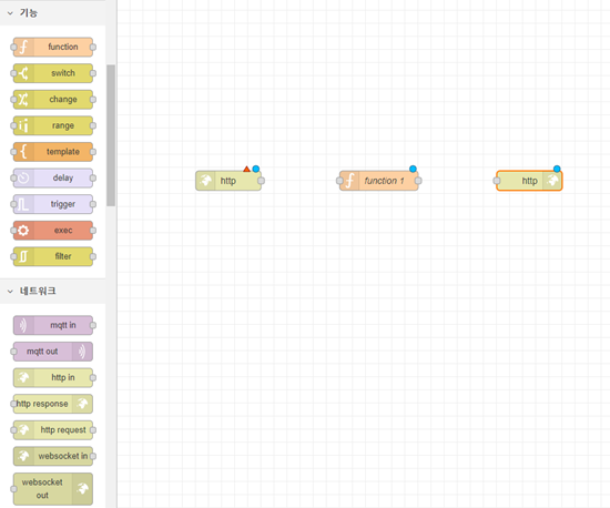 그림1처럼 왼쪽 네트워크 탭에서 http in과 http response 노드를, 기능 탭에서 function 노드를 끌어다 플로우1에 배치한다.