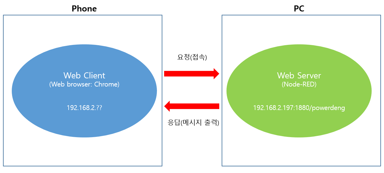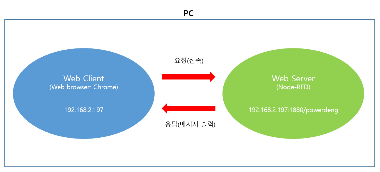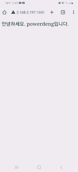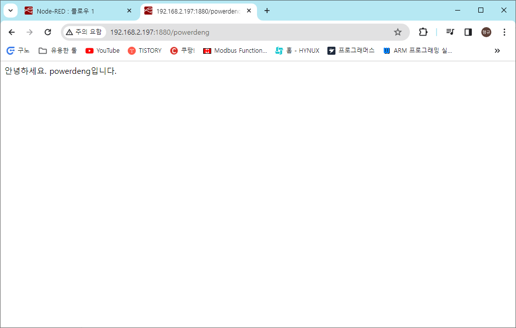 192.168.2.197의 1880포트를 사용하는 Node-RED 웹 서버가 열리면, Web browser(크롬)로 그 웹 서버의 경로 중 /powerdeng에 접속을 요청한다. 그러면 서버에서 "안녕하세요 powerdeng입니다."라는 메시지를 응답으로 보내주도록 서버를 Node-RED로 만드는 예제를 진행하려고 한다.