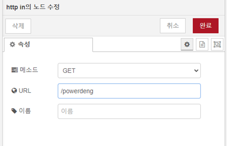 http in 노드를 더블클릭하면 그림2처럼 노드를 수정하는 창이 뜬다.