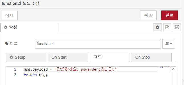 msg.payload = "안녕하세요. powerdeng입니다.";