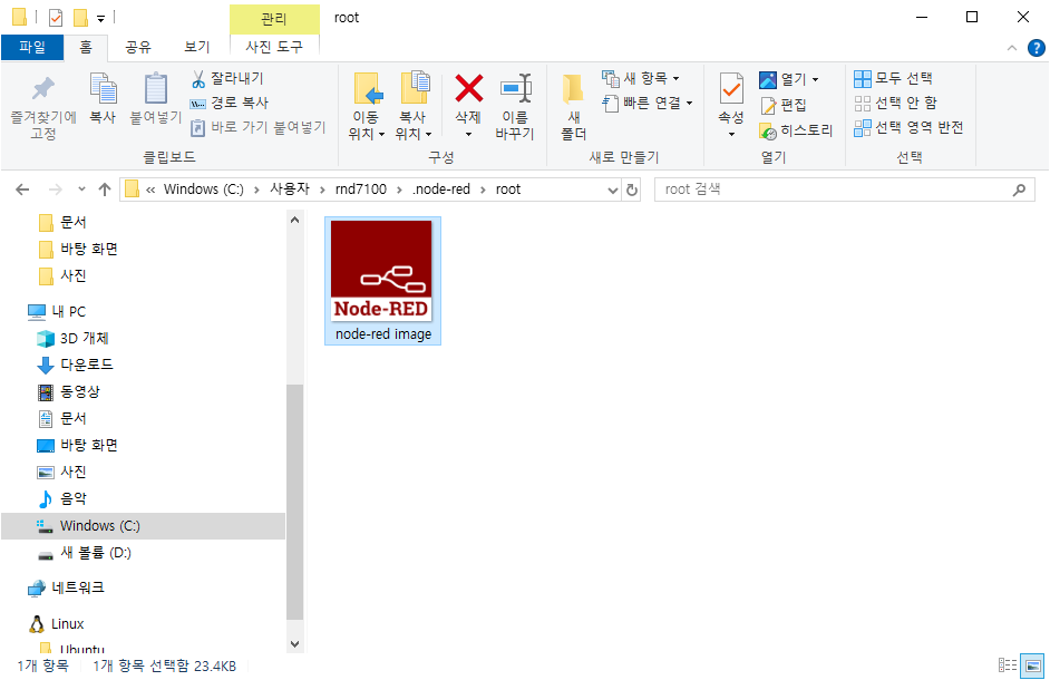 ※ 윈도우에서는 경로를 표현할 때 directory 사이에 '\' 역슬래시 기호를 사용하지만 Node-RED에서는 '/' 슬래시 기호를 사용한다.