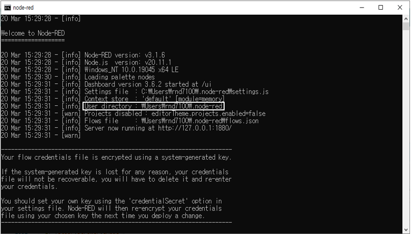 cmd창에 node-red를 입력하면 그림1처럼 메시지가 나오는데 표시한 부분의 경로를 확인한다.
