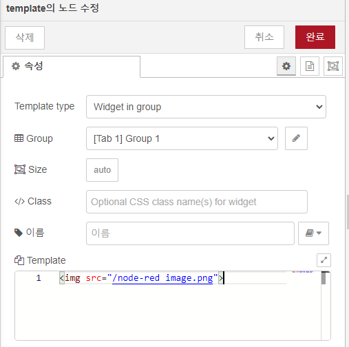 그림7처럼 Node-RED 왼쪽 dashboard 탭에서 template 노드를 끌어다 놓는다.