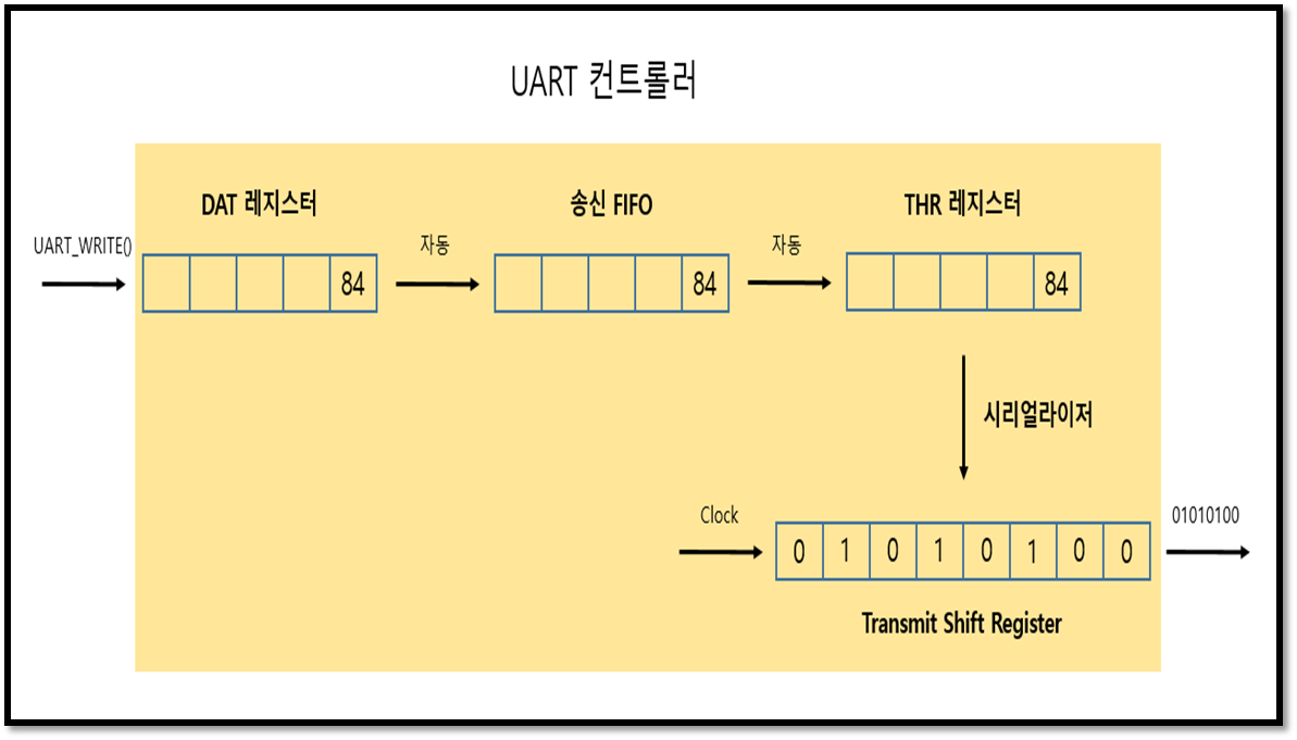 데이터가 송신 FIFO로 들어오면, UART 컨트롤러는 해당 값을 THR(Transmit Holding Register) 레지스터로 전송합니다. 이 과정에서 THR 레지스터는 송신할 데이터를 순차적으로 받아들이며, 송신이 완료되면 다음 데이터를 대기 FIFO에서 가져옵니다.