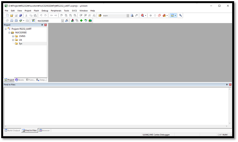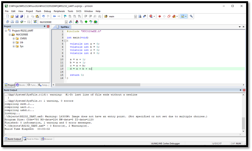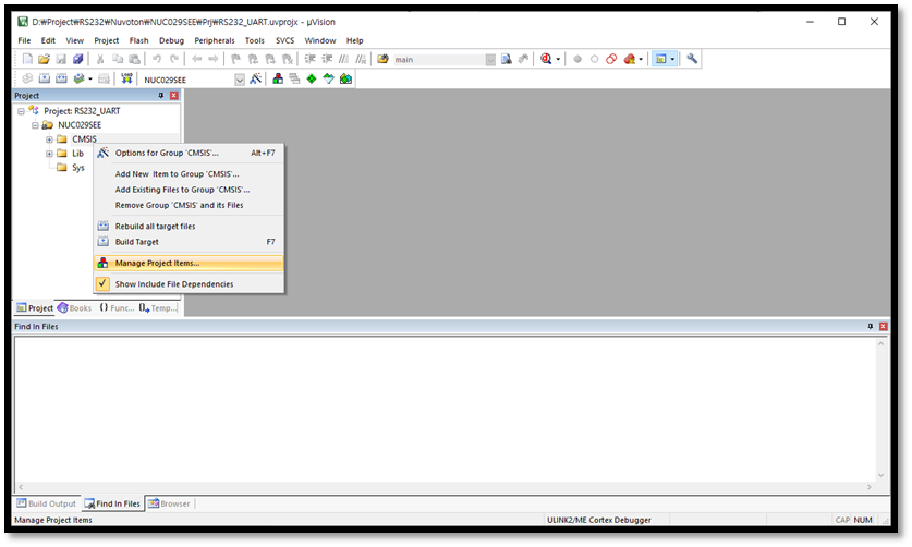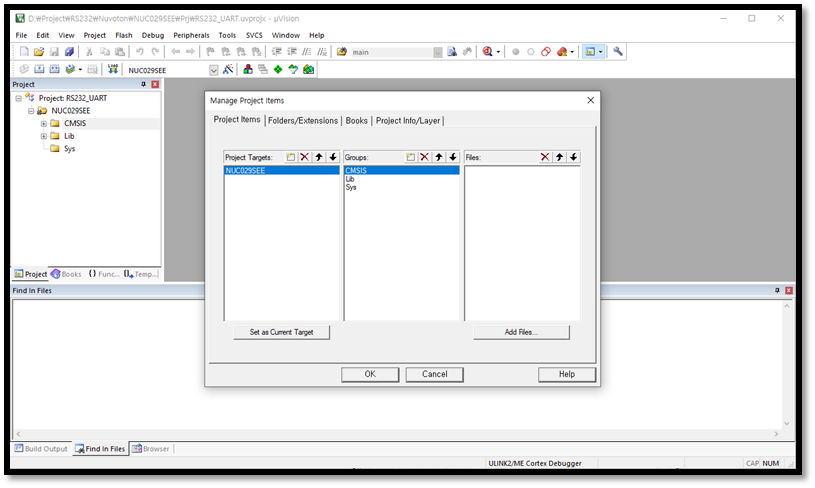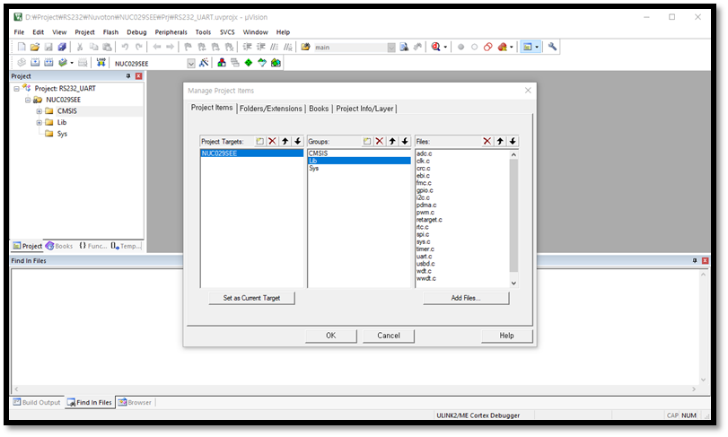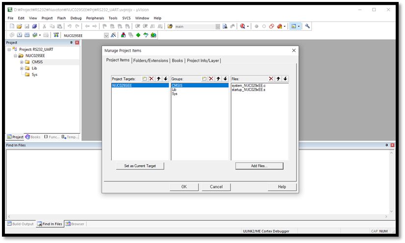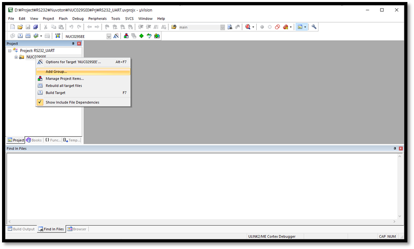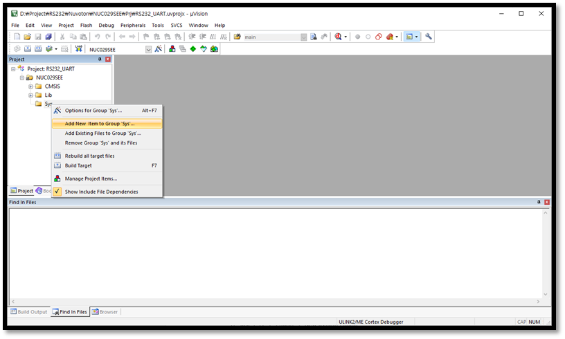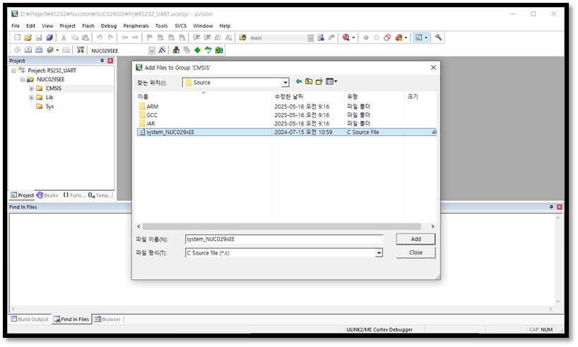 D드라이브 -> Project -> RS232 -> Nuvoton -> NUC029SEE -> Bsp -> en-us--NUC029xEE_Series_BSP_CMSIS_V3.00.004 -> Library -> Device -> Nuvoton -> NUC029xEE -> Source -> system_NUC029xGE.c파일을 Add한다.