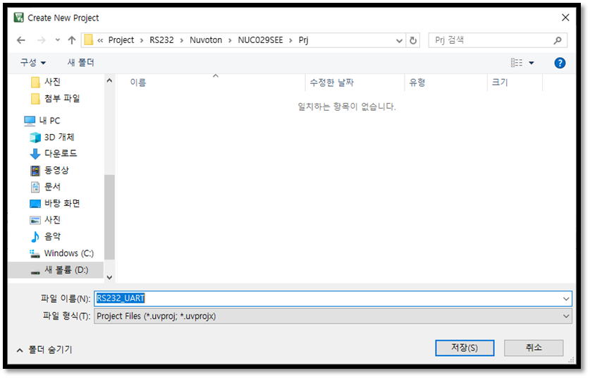 4) 2-1)에서 만든 Prj 폴더를 선택하고 파일 이름(여기서는 RS232_UART)을 입력하고 저장한다.
