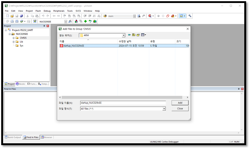 D드라이브 -> Project -> RS232 -> Nuvoton -> NUC029SEE -> Bsp -> en-us--NUC029xEE_Series_BSP_CMSIS_V3.00.004 -> Library -> Device -> Nuvoton -> NUC029xEE -> Source -> ARM -> 파일 형식을 모든 파일로 변경 -> startup_NUC029xGE.s 파일을 Add한다.