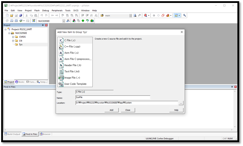 Location은 D:/Project/RS232/Nuvoton/NUC029SEE/App/System으로 지정한 뒤 Add를 누른다.