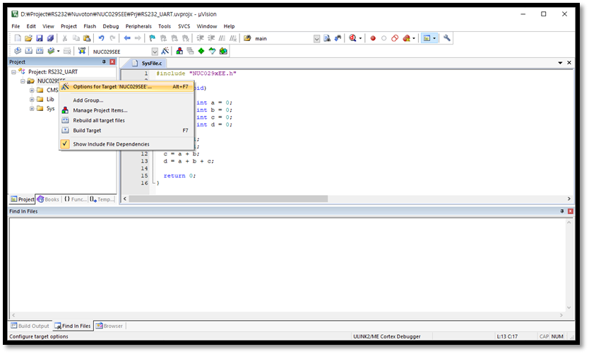 1) 왼쪽 Project탭에서 NUC029SEE를 오른쪽 클릭한 뒤 Options for Target 'NUC029SEE'를 선택한다.