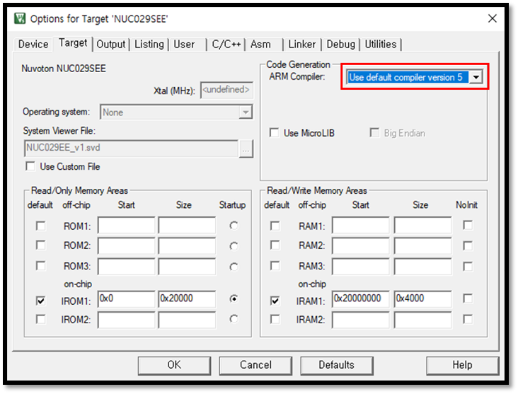 2) Target탭에서 아래 그림처럼 빨간색 표시된 부분을 Use default compiler version 5로 변경한다.