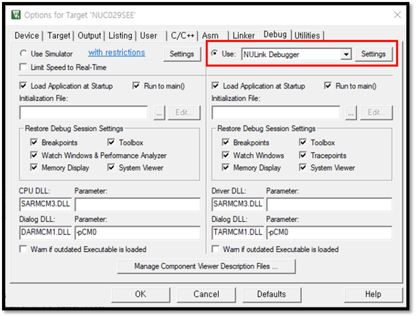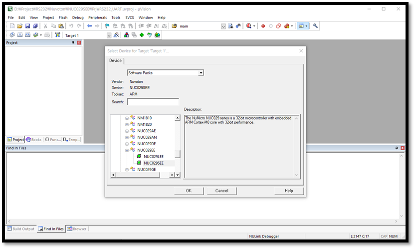 Devices탭 -> Nuvoton -> NuMicro M0 Family -> NUC029EE -> NUC029SEE 선택