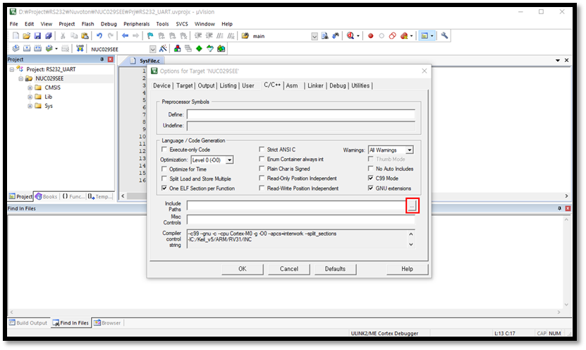 D드라이브 -> Project -> RS232 -> Nuvoton -> NUC029SEE -> Bsp -> en-us--NUC029xEE_Series_BSP_CMSIS_V3.00.004 -> Library -> Device -> Nuvoton -> NUC029xGE -> Include 폴더 선택