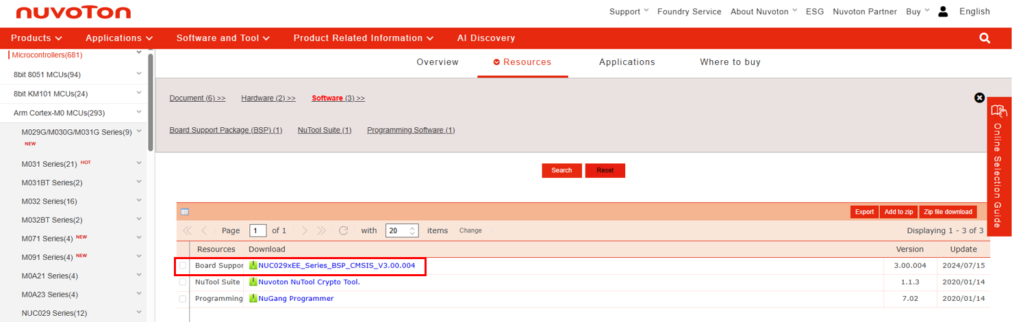 4-1) Nuvoton 홈페이지(아래 링크)에서 내가 사용할 칩(NUC029SEE) 검색후 Software 클릭