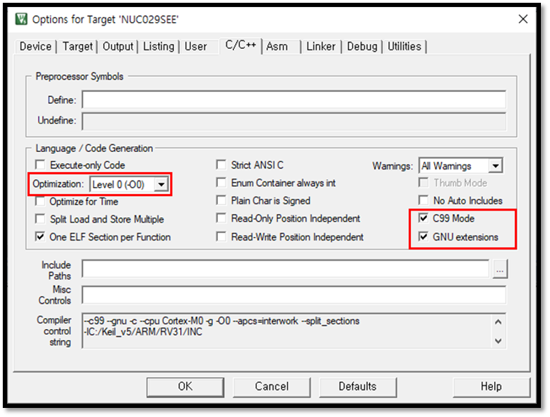 Nuvoton CMSIS 드라이버가 대부분 C99 기반으로 작성되어 있다.