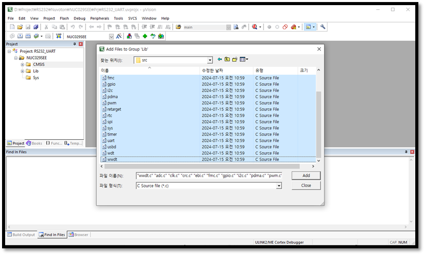 D드라이브 -> Project -> RS232 -> Nuvoton -> NUC029SEE -> Bsp -> en-us--NUC029xEE_Series_BSP_CMSIS_V3.00.004 -> Library -> StdDriver -> src -> 모든 파일 선택 후 Add한다.