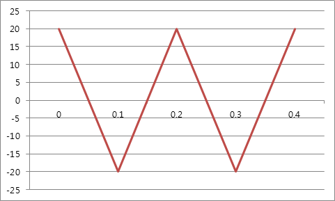 - GS200은 직류 전압만 만들 수 있어서 엑셀로 프로그램 하여 교류전압을 만들어야 한다. 여기서는 Interval Time을 0.1초로 하고 20V와 -20V사이를 반복하도록 프로그램 했다.