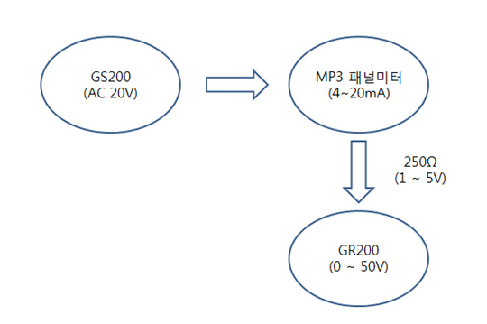 GS200에서 만든 교류 전압을 MP3 패널미터를 사용하여 직류 전류로 바꾼 뒤 저항을 연결하여 1~5V의 직류 전압을 GR200으로 보내서 0~50V의 범위로 기록한다.
